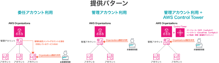 | 委任アカウント利用プラン | 管理アカウント利用プラン | 管理アカウント利用プラン + AWS Control Tower | |